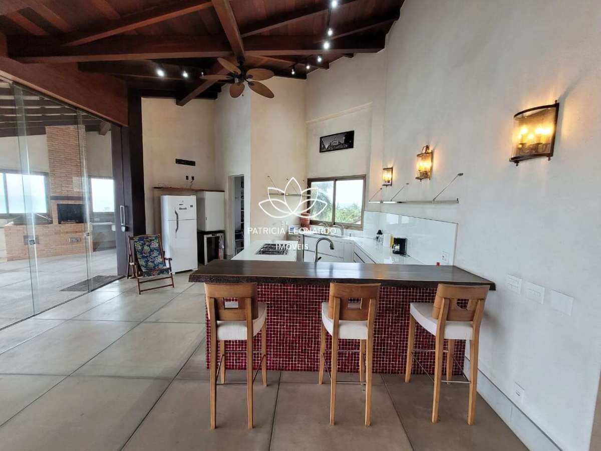 Segundo Pavimento: Uma super sala com pé direito alto com dois ambientes, cozinha americana com armários da marca Florence, cooktop e forno de marca Italiana, bancada para refeições em madeira rústica, bancada da pia de nanoglass e uma ampla despensa.
