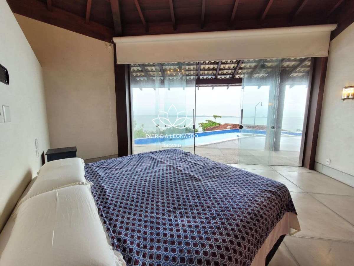 Uma linda e ampla suíte master com vista para o mar e para a piscina, essa de borda infinita, um closet com armários da marca Florence.